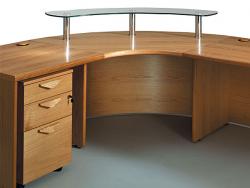 The first impression a company makes on a visitor is often the most important one. Fusion is a modular system of contemporary receptionist furniture, finished with high quality wood veneer and featuring clean contemporary lines, with a recessed metallic kick plate.