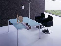 The X4 glass meeting and conference tables: 4 shapes of interchangeable legs on the same frame with 3 different finishes, 8 melamine tops finishes with bi colour edge and 4 glass top colours to choose from.