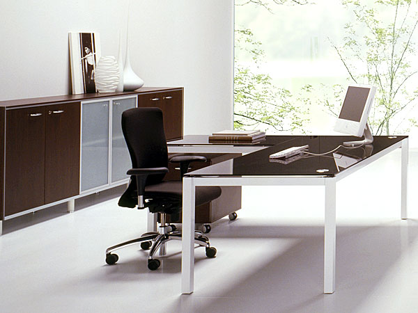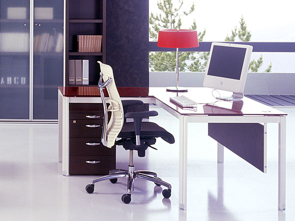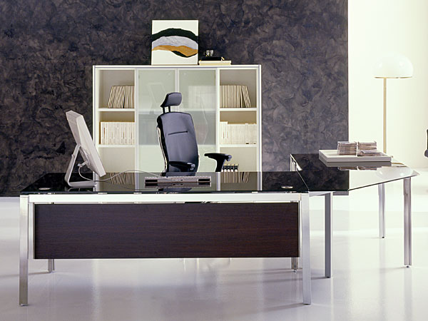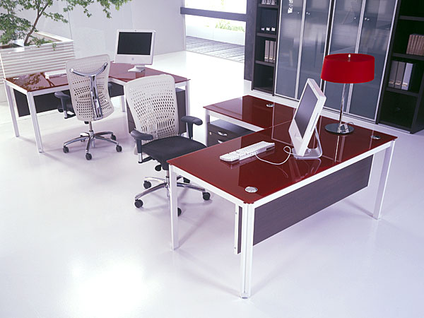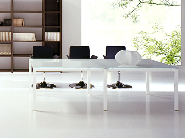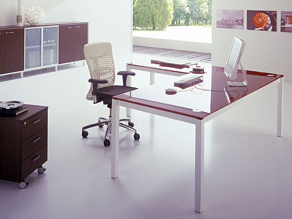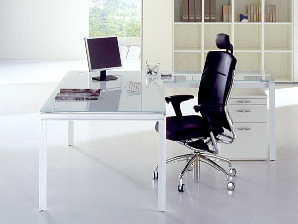 X4 Glass Desks: design and functionality in a system with the right numbers. 4 sections of interchangeable legs on the same frame with 3 different finishes, 8 finishes of melamine tops with bicolour edge, 4 glass top colours for 144 different combinations.