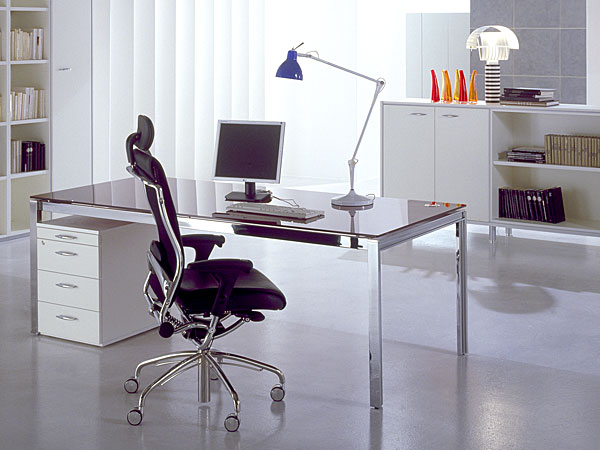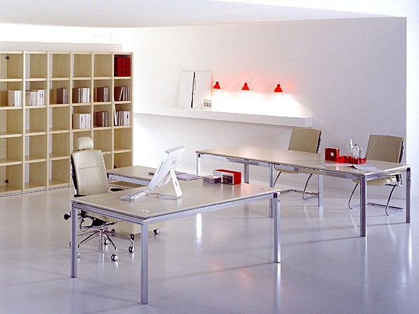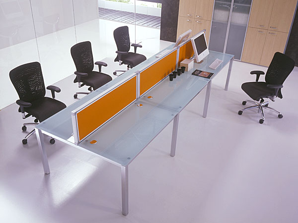 X4: design and functionality in a bench desk system with the right numbers: 4 sections of interchangeable legs on the same frame with 3 different finishes, 8 finishes of melamine tops with bicolour edge, 4 glass top colours for 144 different combinations.