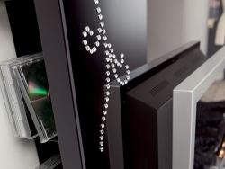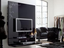 Moda Plasma Holders The Moda Look and Revolving plasma stand structure is in multilayer bentwood and ecological panel with acid-etched glass top with a painted metal frame for CDs and DVDs. Extra lacquered bun feet for assembly are supplied. Available only in lacquered version (colours as per pattern book), with contrasting silk-screen print on a lacquered base or with hand-made sequined decoration.