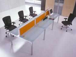 X4: design and functionality in a bench desk system with the right numbers: 4 sections of interchangeable legs on the same frame with 3 different finishes, 8 finishes of melamine tops with bicolour edge, 4 glass top colours for 144 different combinations.