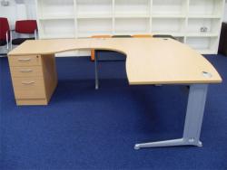 A stunning bow front crescent desk with cantilever leg, beach finish and desk high pedestal with curved over hanging top.